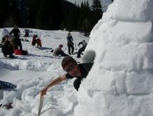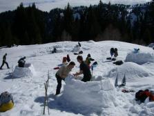 Was ein echter Trapper ist, der muss wissen, wie er sich für den Fall des Falles eine gute Übernachtungsmöglichkeit schafft, deswegen steht auch ein Iglu- oder Schneehöhlenbau auf dem Programm. Teamwork ist gefragt, denn nur wenn alle zupacken, kann das Iglu gelingen. Von ferne hört man nun schon das Heulen der Schlittenhunde, die ihren Ruf nach Freiheit heulen, und von einem erfahrenen Musher (Hundeschlittenführer) erfahren die Teilnehmer viel Wissenswertes über diese faszinierenden Tiere und den Umgang mit ihnen. Schließlich darf jeder Teilnehmer mit dem Gespann selbst eine Runde drehen – da kommt wahres Trapper-Feeling auf! (Optional)